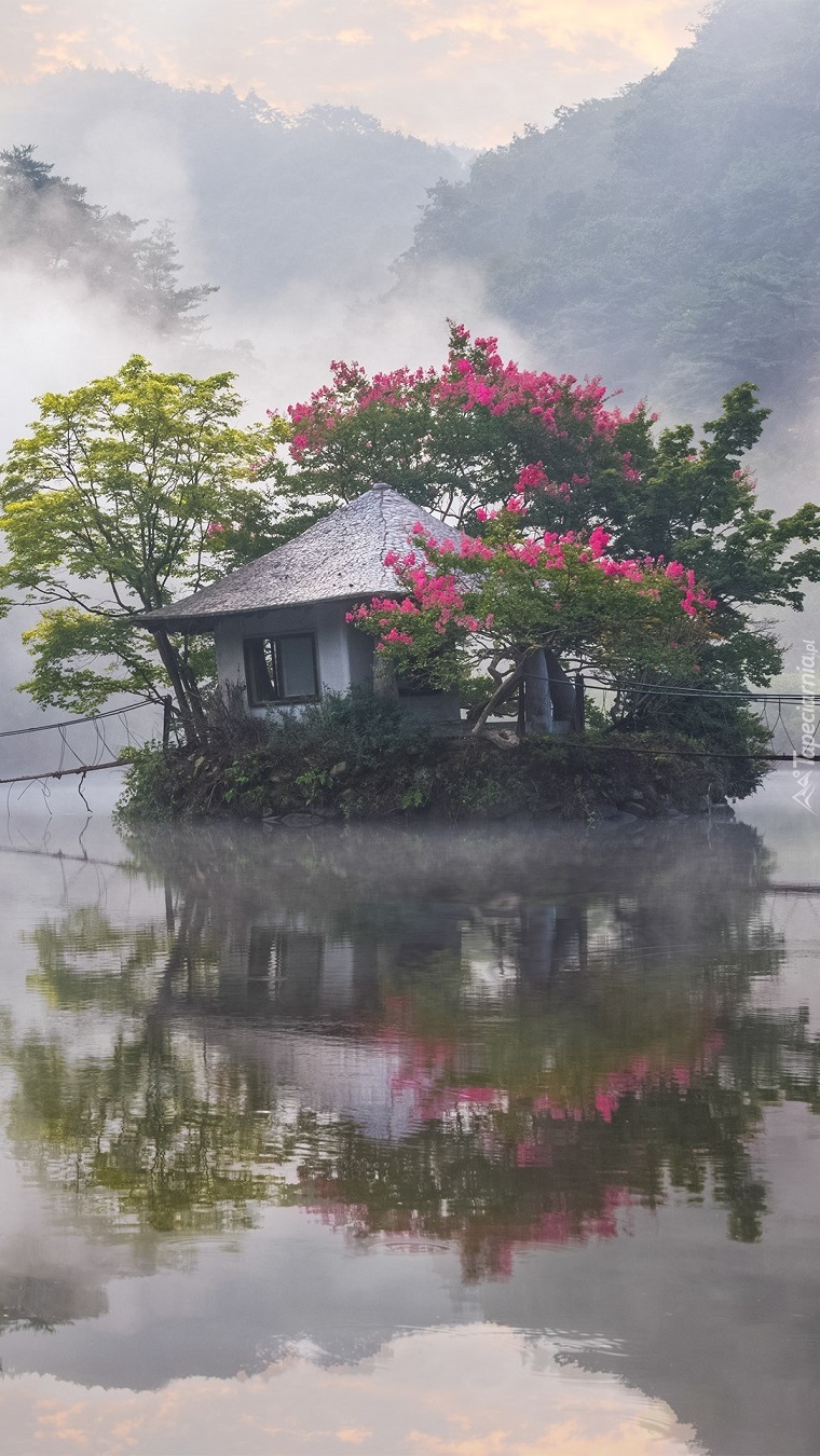 Edytor tapety: Kwitnące drzewa wokół domku na wodzie