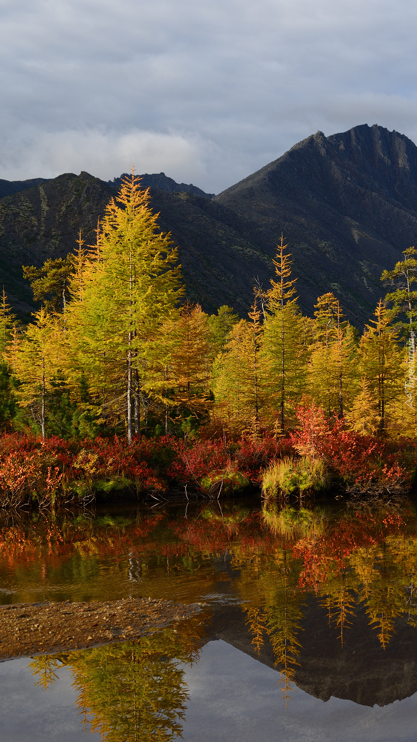 Edytor tapety: Drzewa i góry nad jeziorem Nevidimka