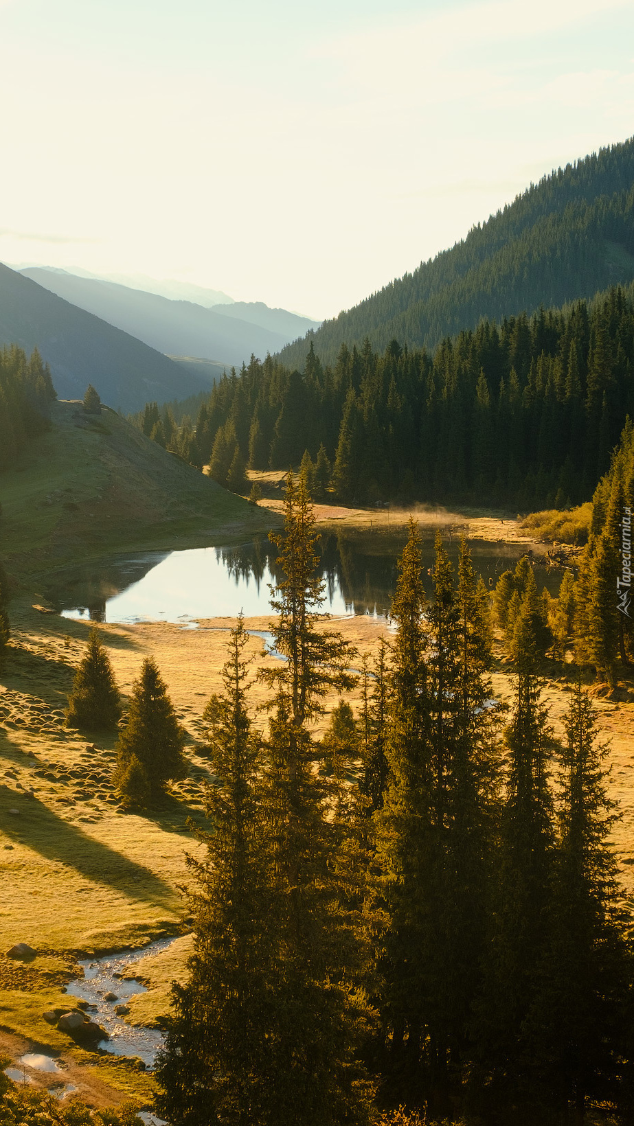 Edytor tapety: Góry i świerki nad jeziorkiem