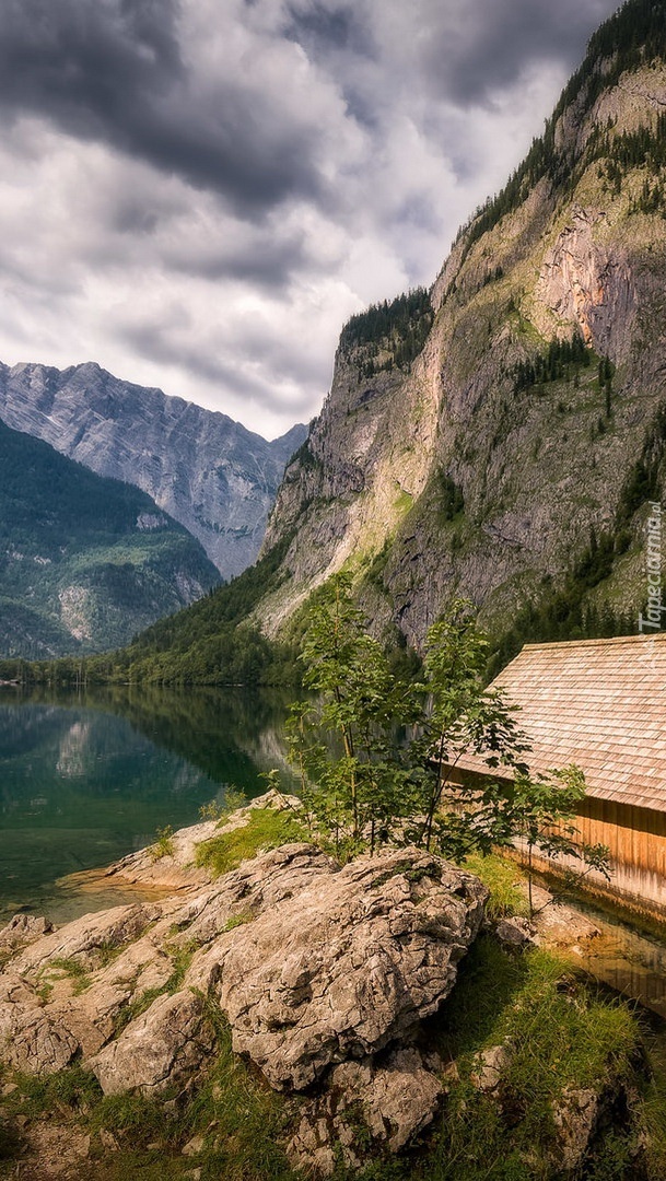 Edytor tapety: Drewniana szopa na tle gór