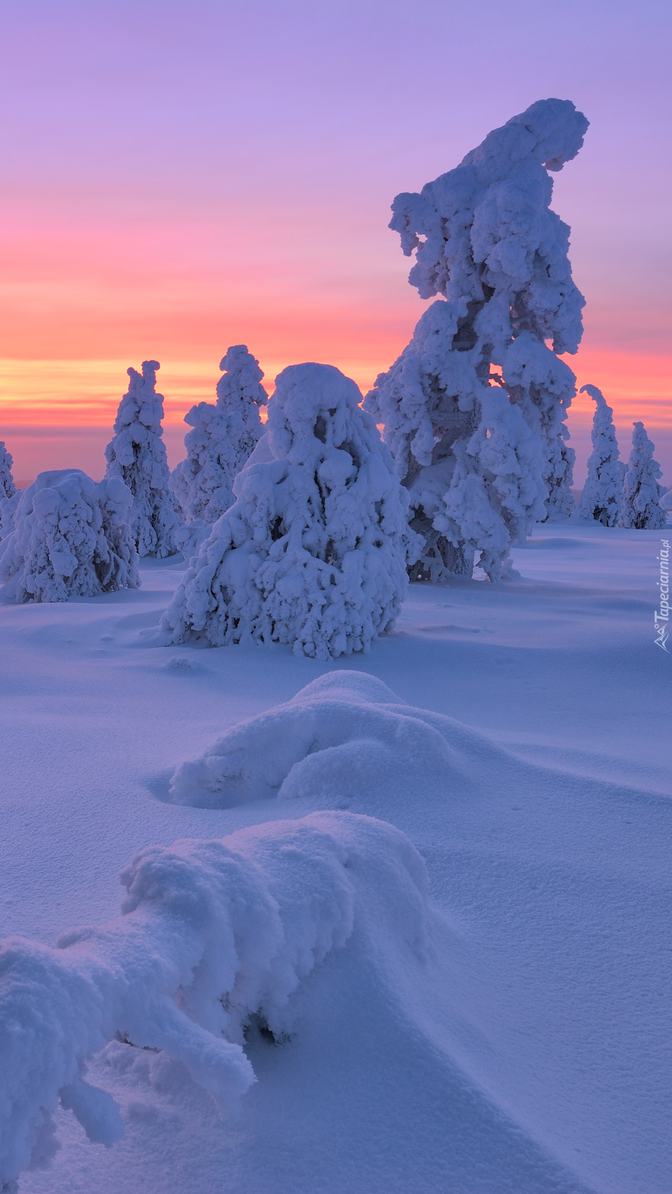 Edytor tapety: Zachód słońca nad ośnieżonymi świerkami