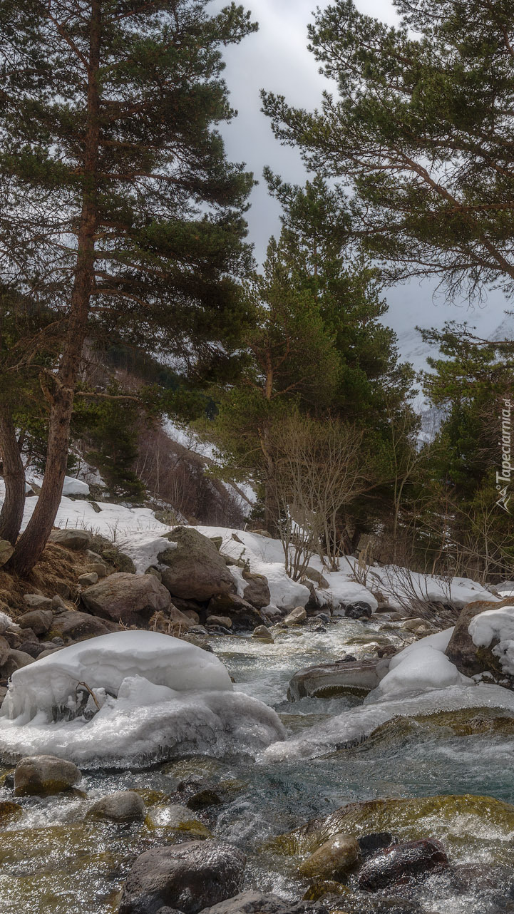 Edytor tapety: Ośnieżone kamienie w leśnym potoku
