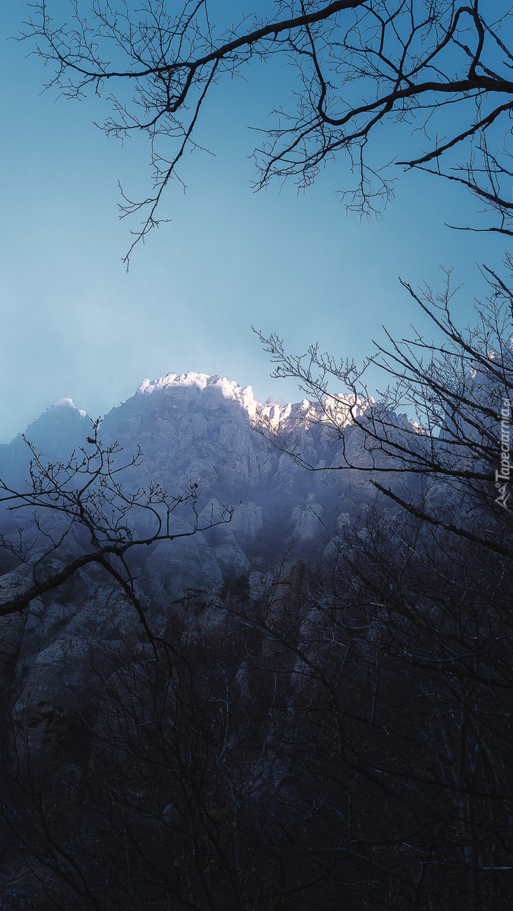 Edytor tapety: Gałęzie drzew na tle gór