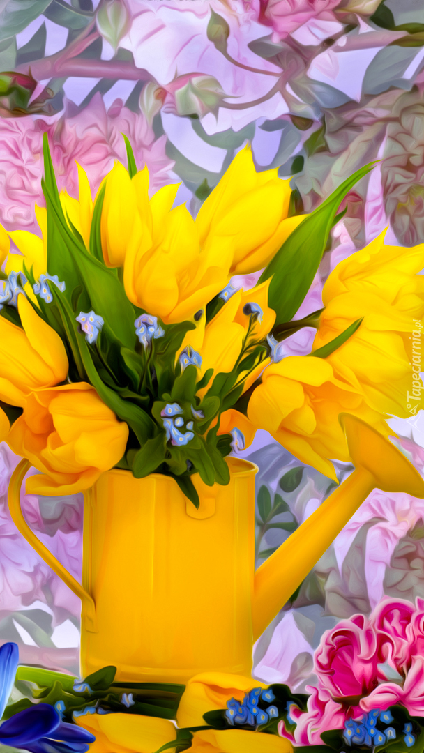 Edytor tapety: Żółte tulipany w konewce