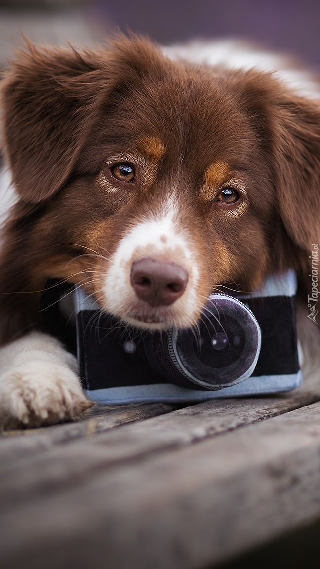 Edytor tapety: Owczarek australijski z aparatem fotograficznym