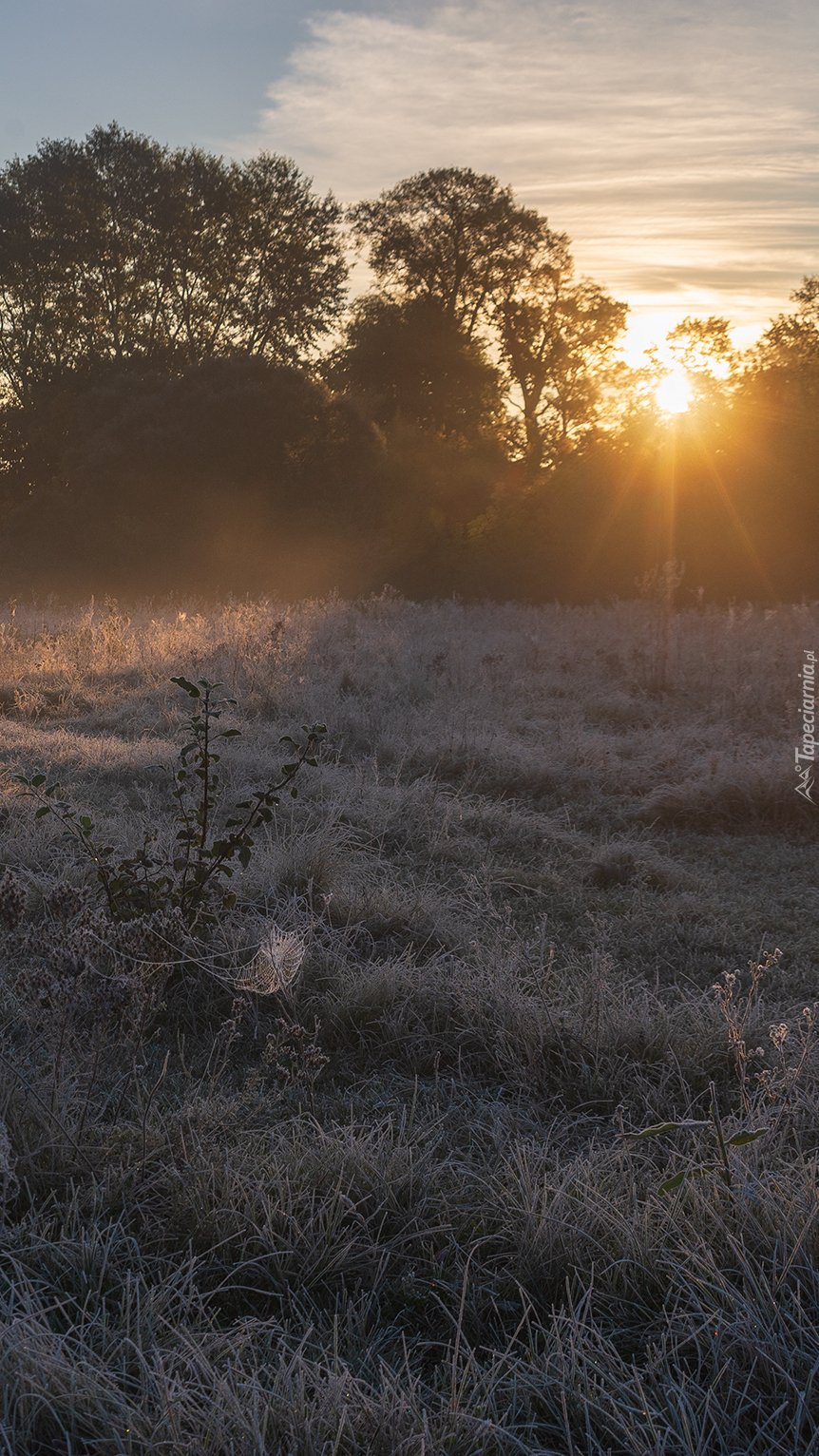 Edytor tapety: Oszroniona łąka w promieniach wschodzącego słońca