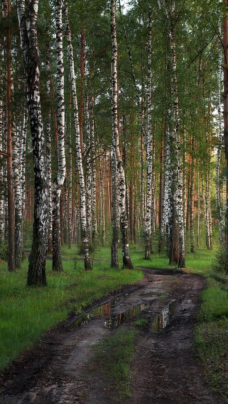 Edytor tapety: Błotnista droga w brzozowym lesie
