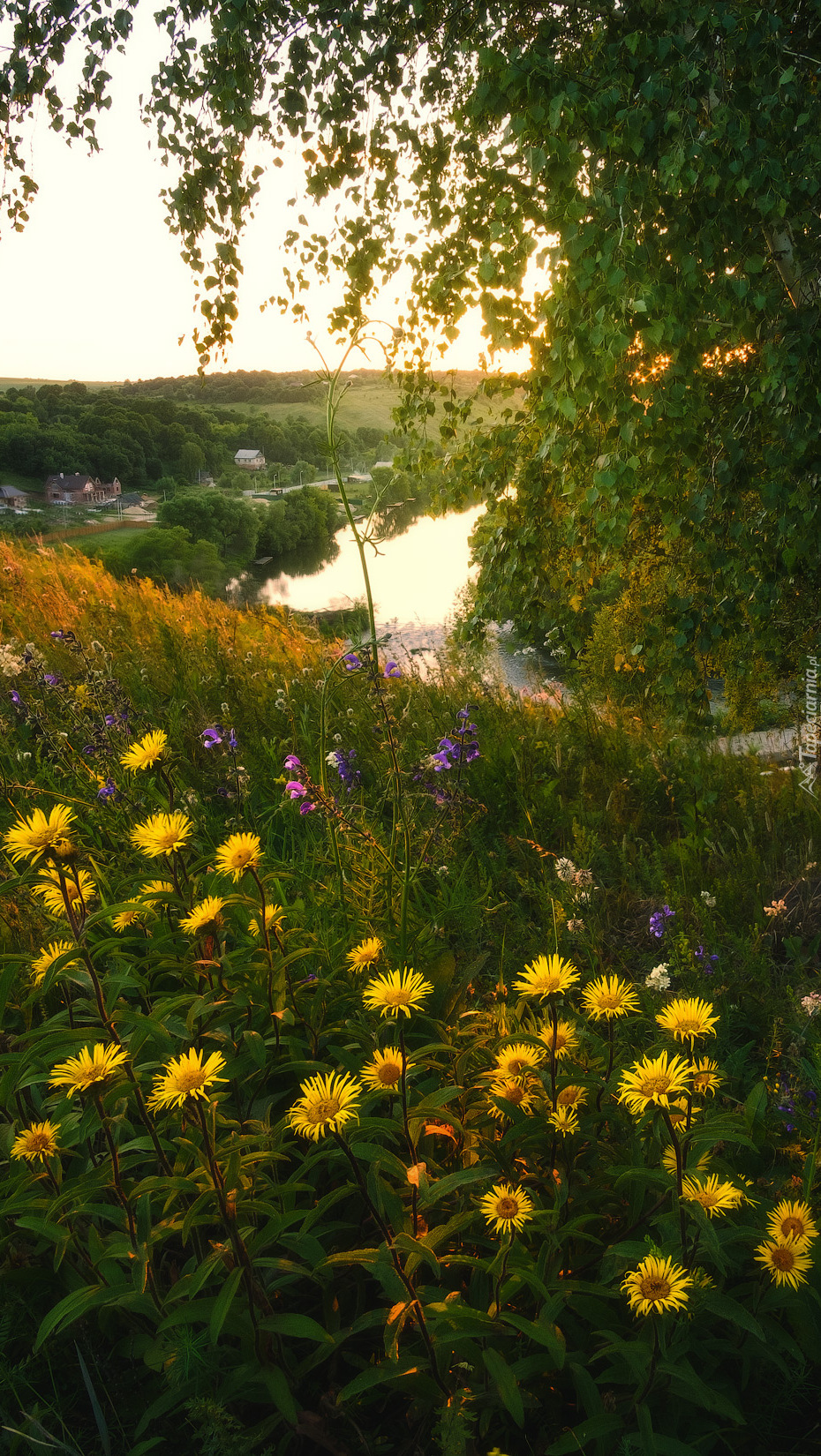 Edytor tapety: Żółte kwiaty nad rzeką Krasivaya Mecha
