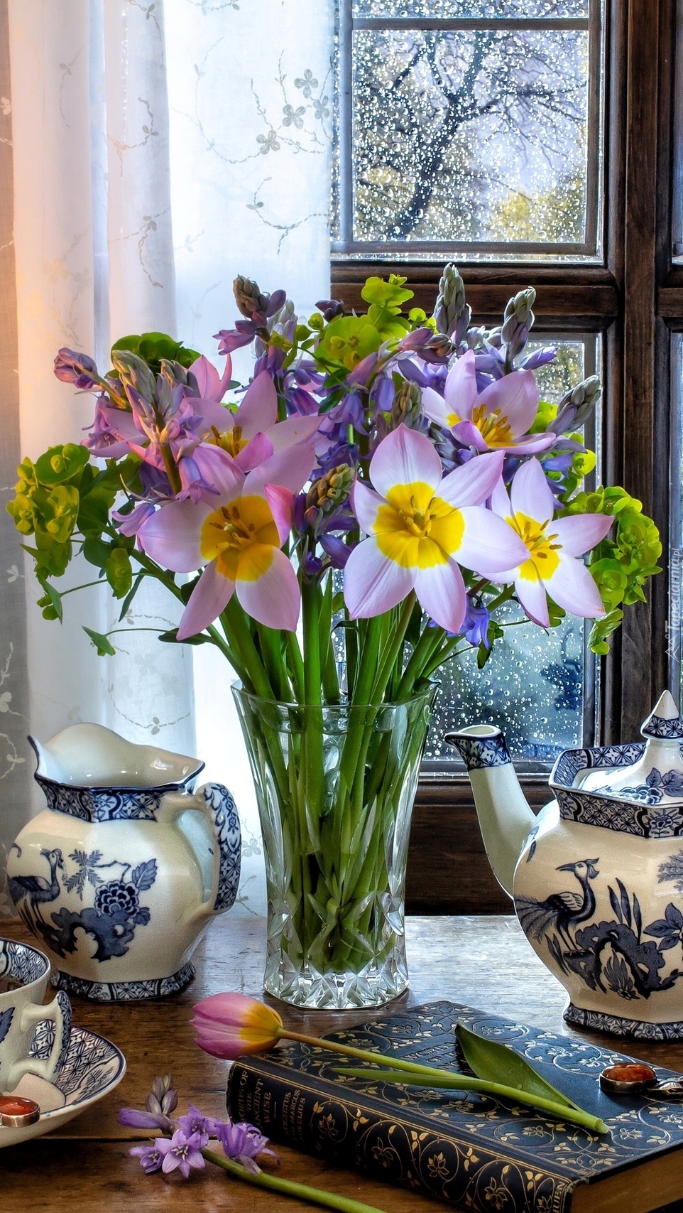 Edytor tapety: Porcelanowa zastawa obok kwiatów w wazonie