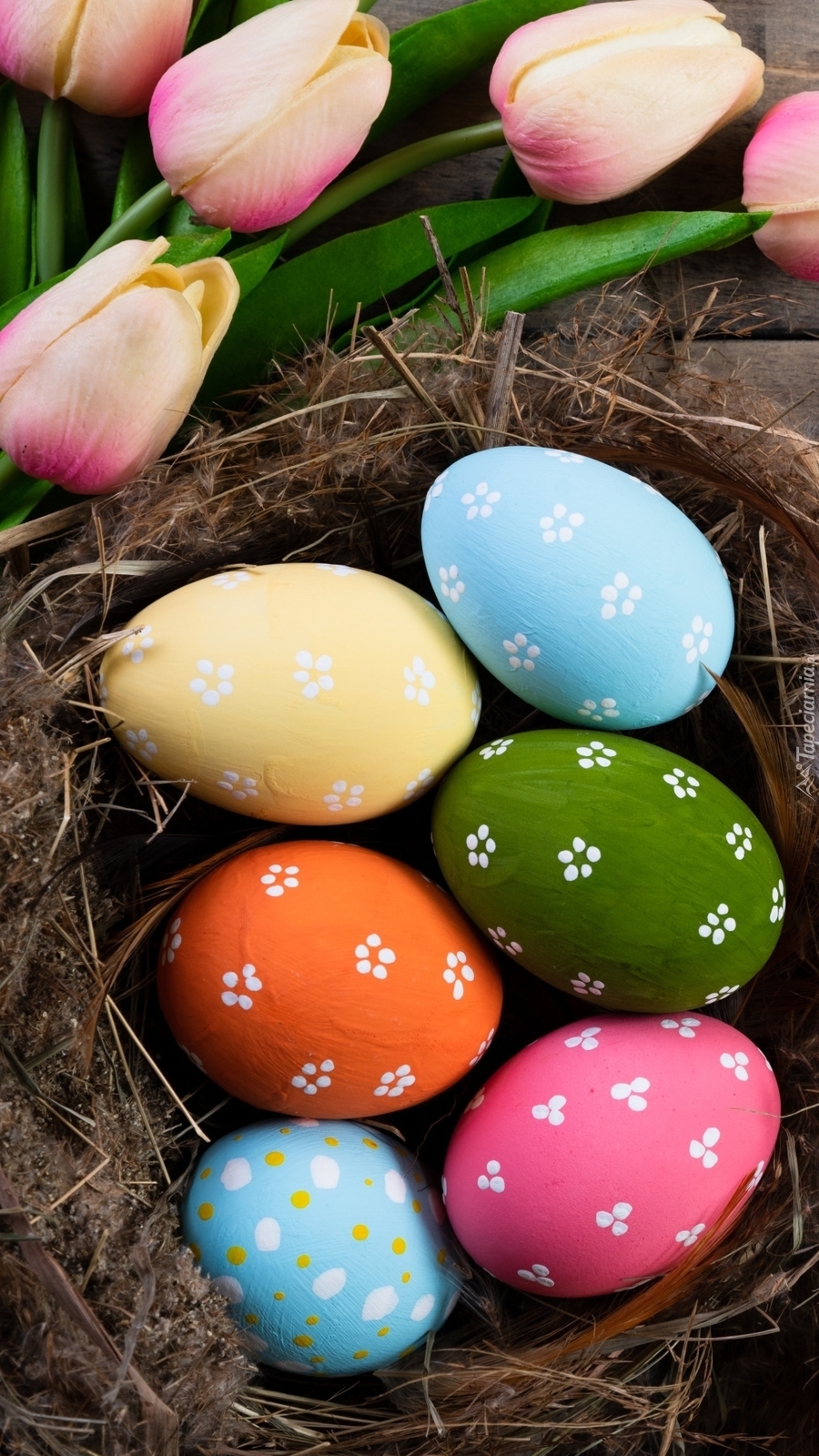 Edytor tapety: Tulipany obok pisanek w gniazdku