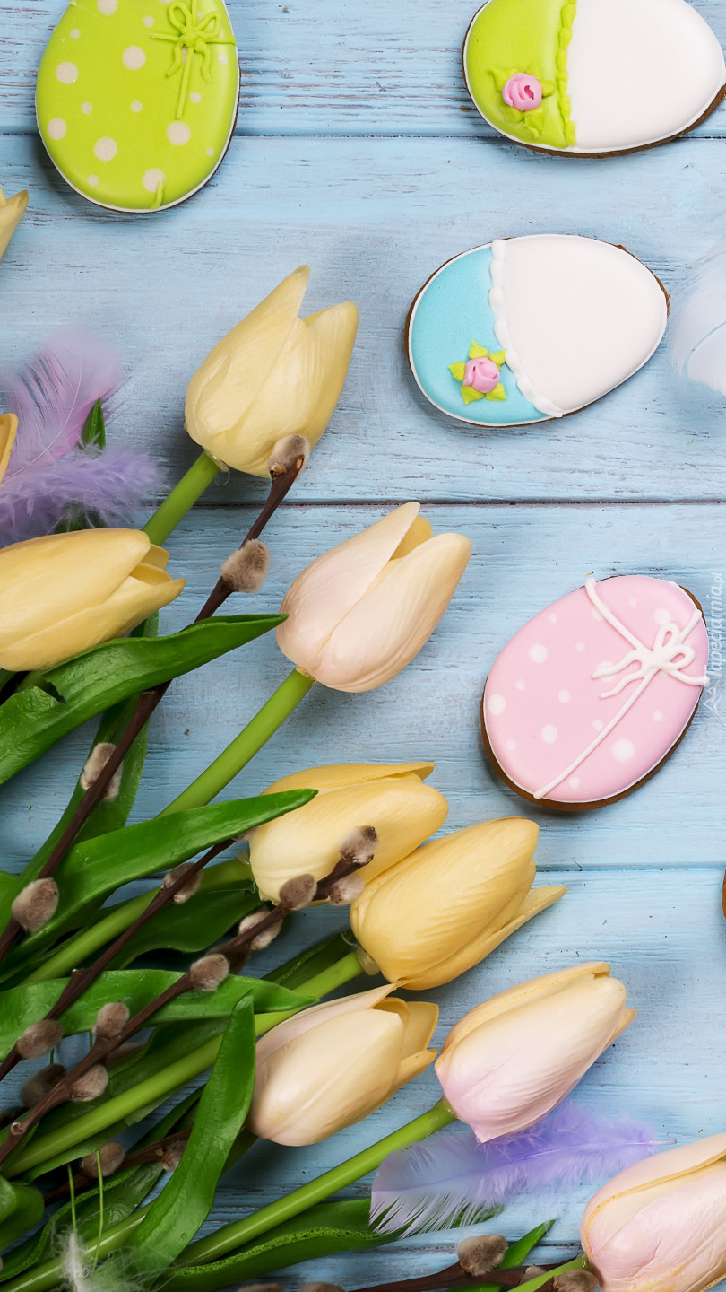 Edytor tapety: Ciasteczkowe pisanki obok tulipanów