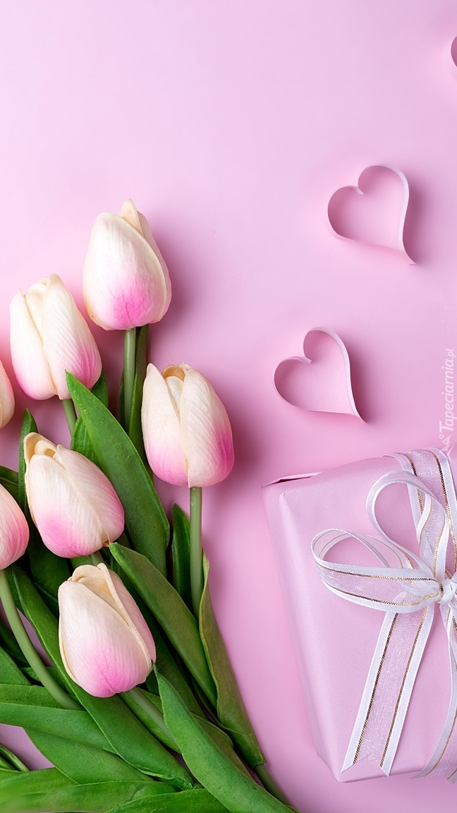 Edytor tapety: Tulipany i prezent na różowym tle