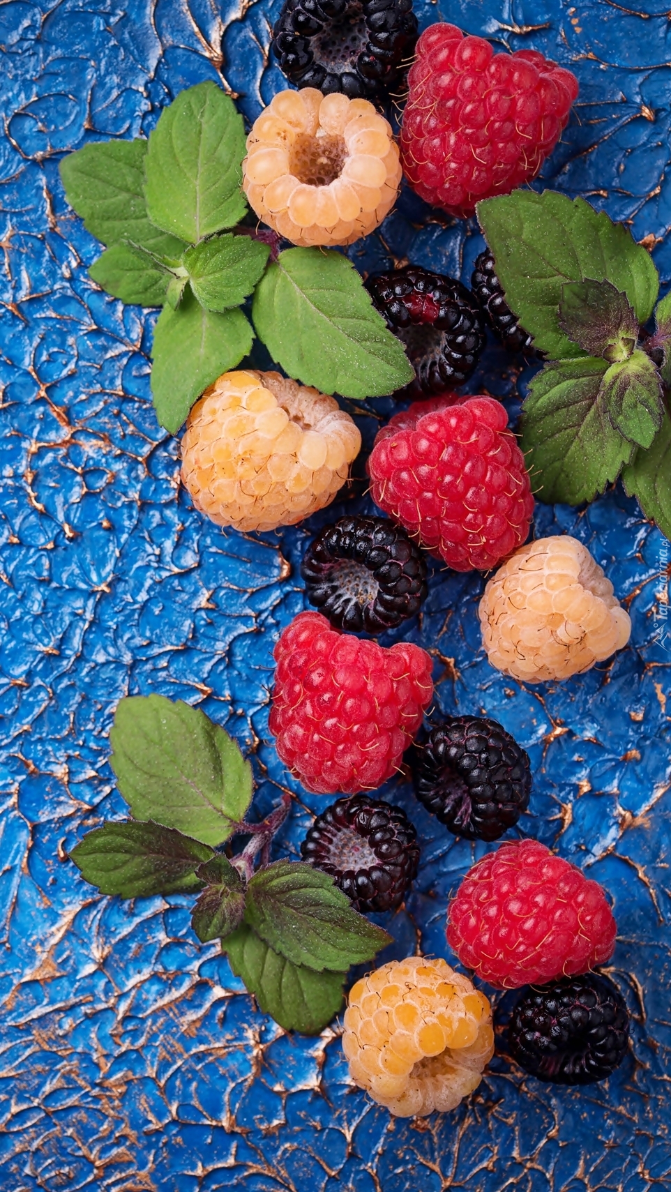 Edytor tapety: Maliny i jeżyny na niebieskim tle