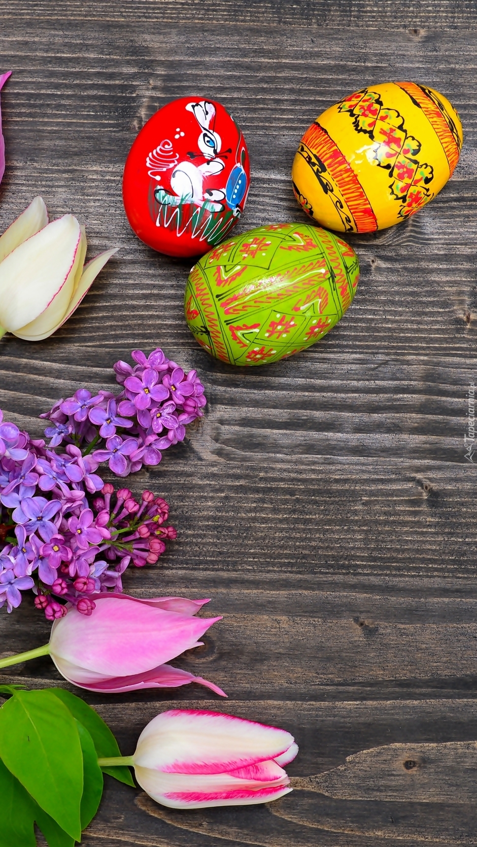 Edytor tapety: Pisanki obok bzu i tulipanów
