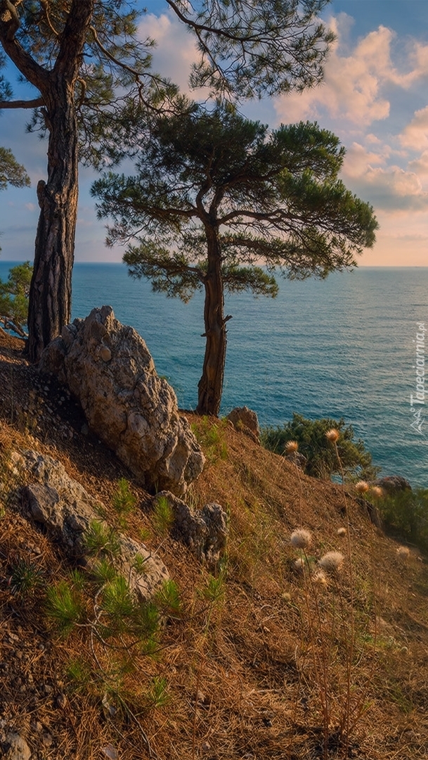Edytor tapety: Skały i drzewa nad morzem