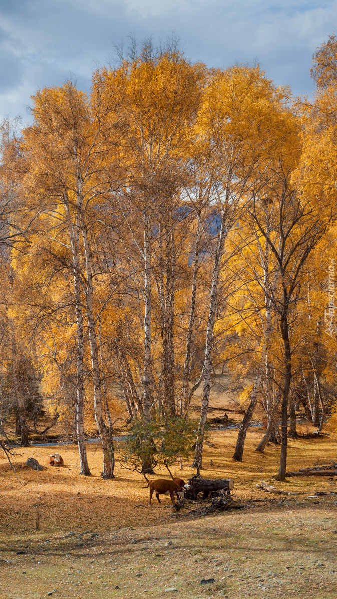 Edytor tapety: Pasące się krowy pod jesiennymi drzewami