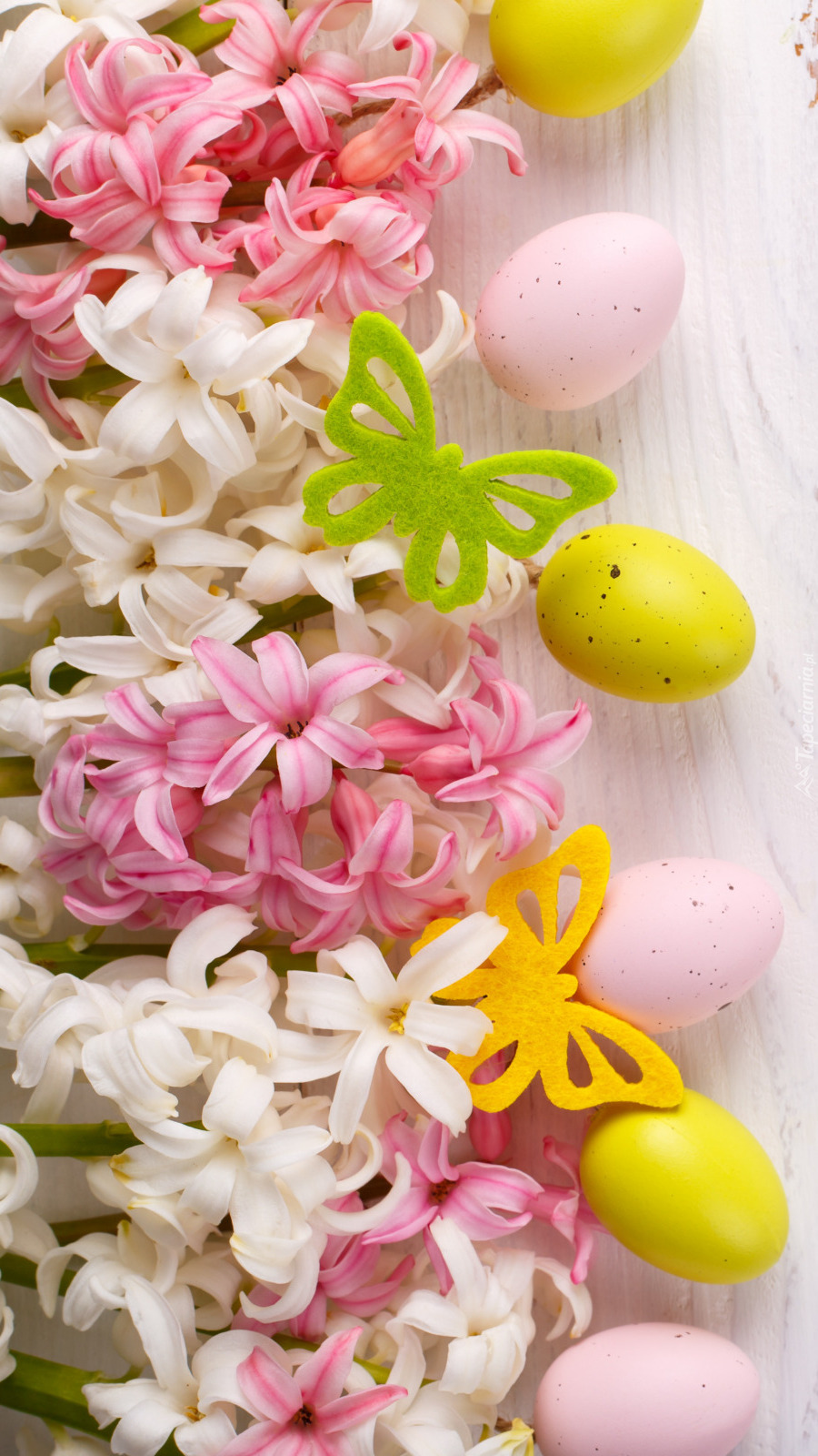 Edytor tapety: Motylki i pisanki przy hiacyntach