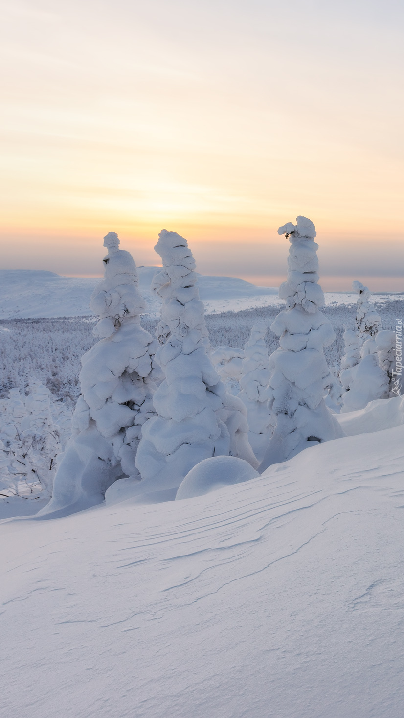 Edytor tapety: Wschód słońca i zaśnieżone drzewa