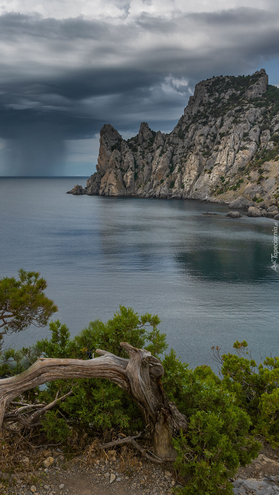 Edytor tapety: Ciemne chmury nad skałami