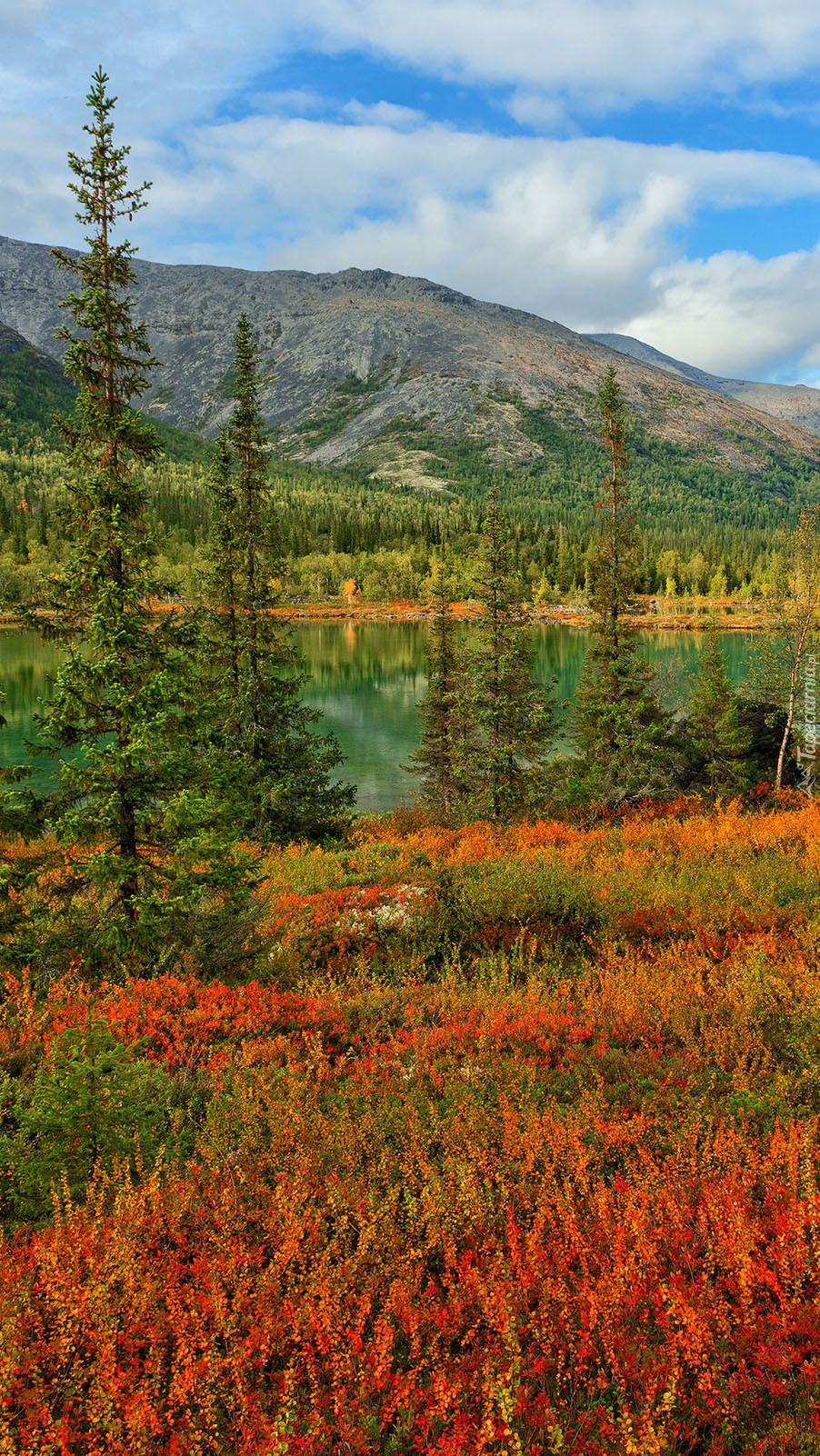 Edytor tapety: Kolorowe drzewa wokół jeziora