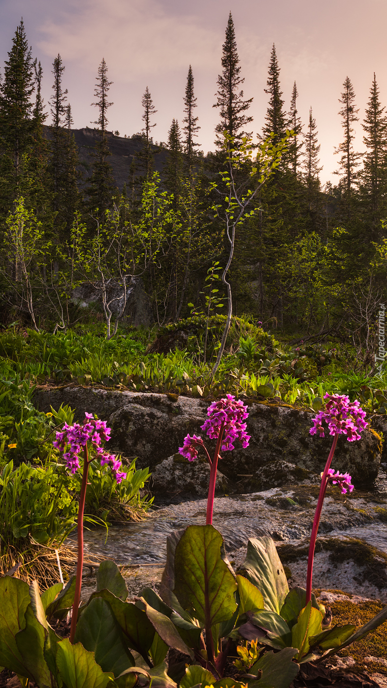 Edytor tapety: Ciemnoróżowe kwiaty przy strumyku