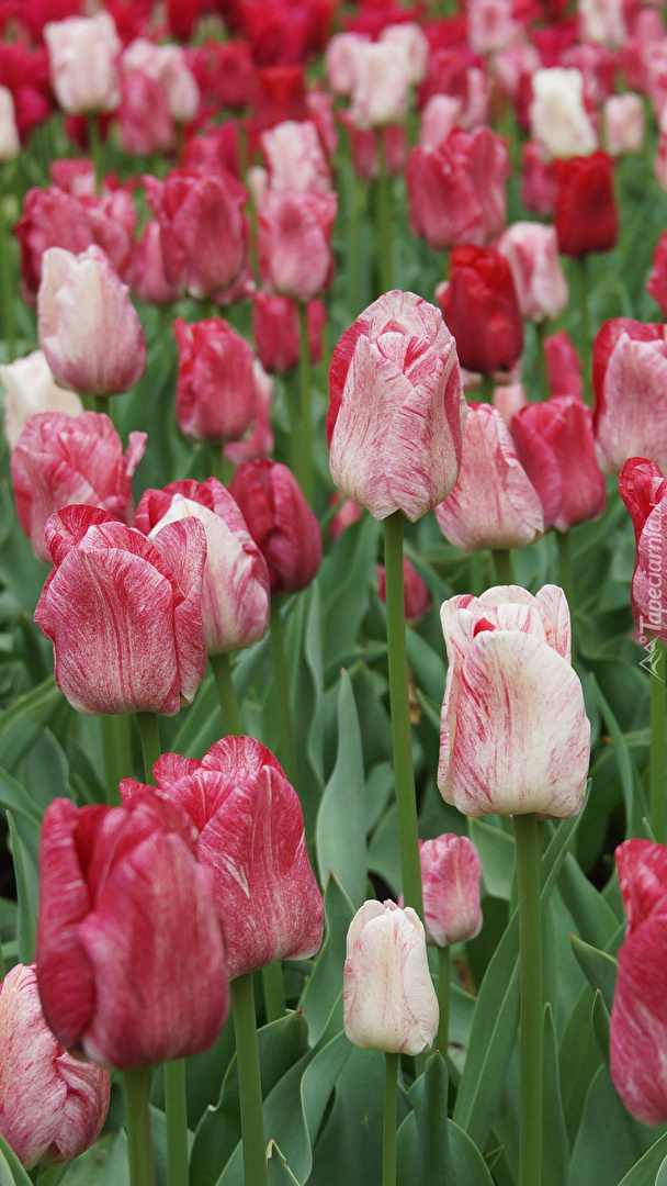 Edytor tapety: Czerwono-białe tulipany na polu
