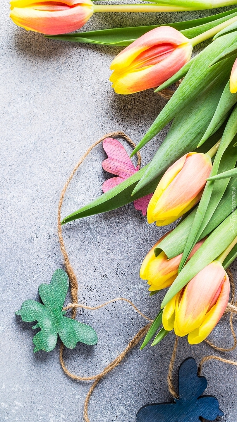 Edytor tapety: Kolorowe tulipany z drewnianymi motylkami