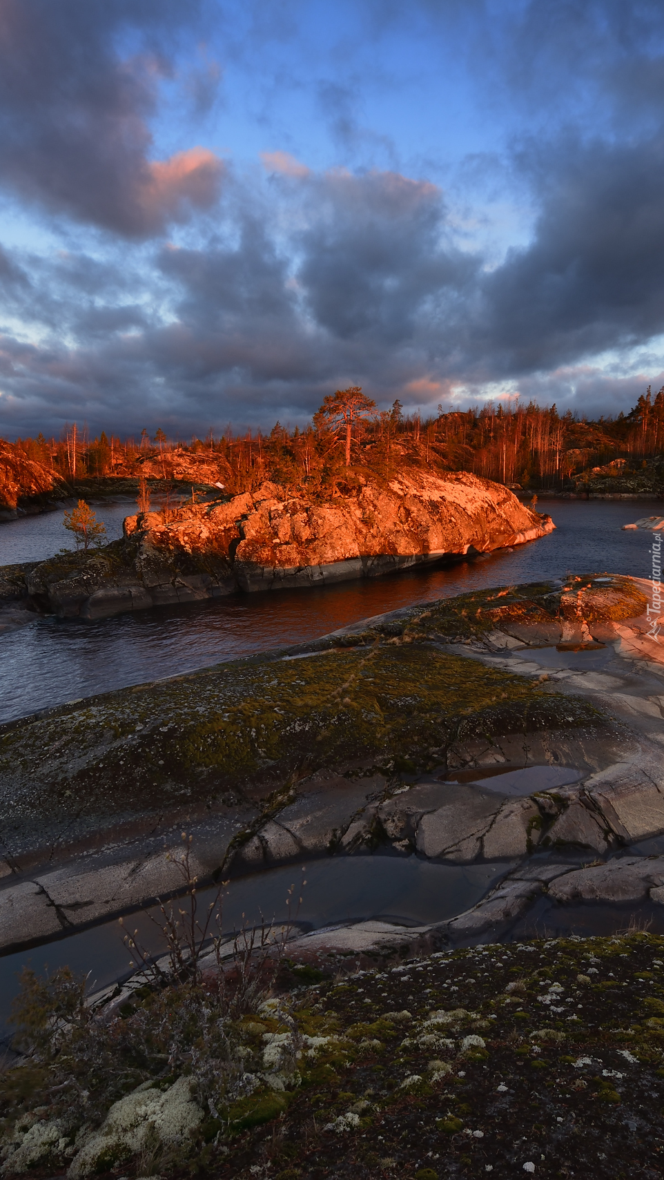 Edytor tapety: Drzewa porastające skały na jeziorze Ładoga