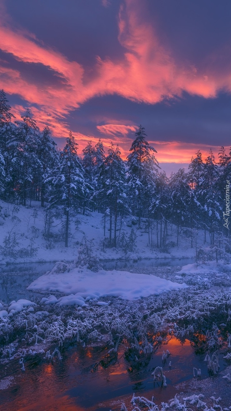Edytor tapety: Różowy wschód słońca nad ośnieżonym lasem