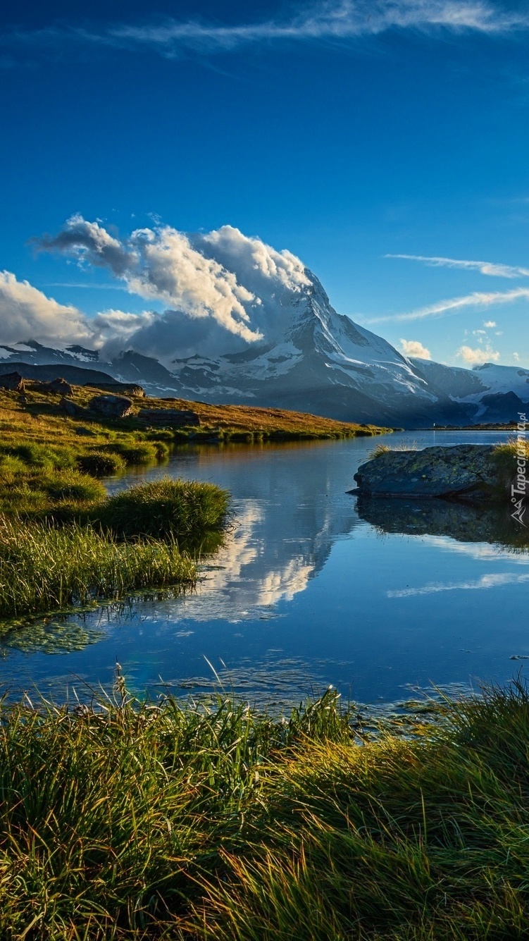 Edytor tapety: Błękit nieba nad górami i jeziorem