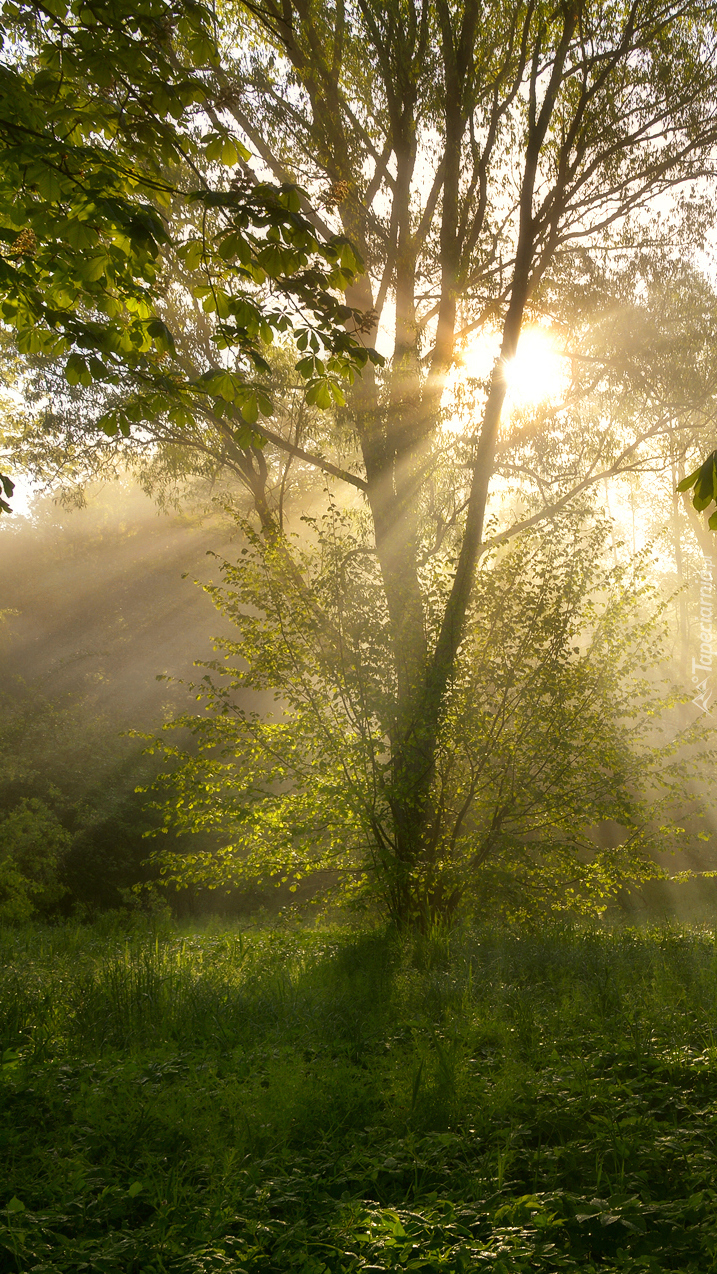 Edytor tapety: Drzewo na polanie w promieniach słońca