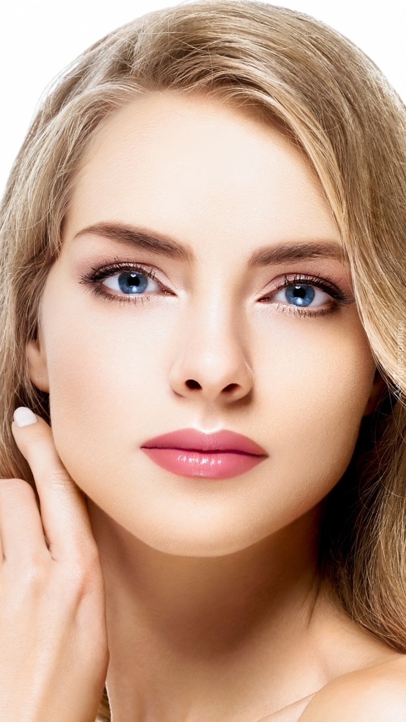 Edytor tapety: Niebieskooka blondynka z dłonią przy policzku