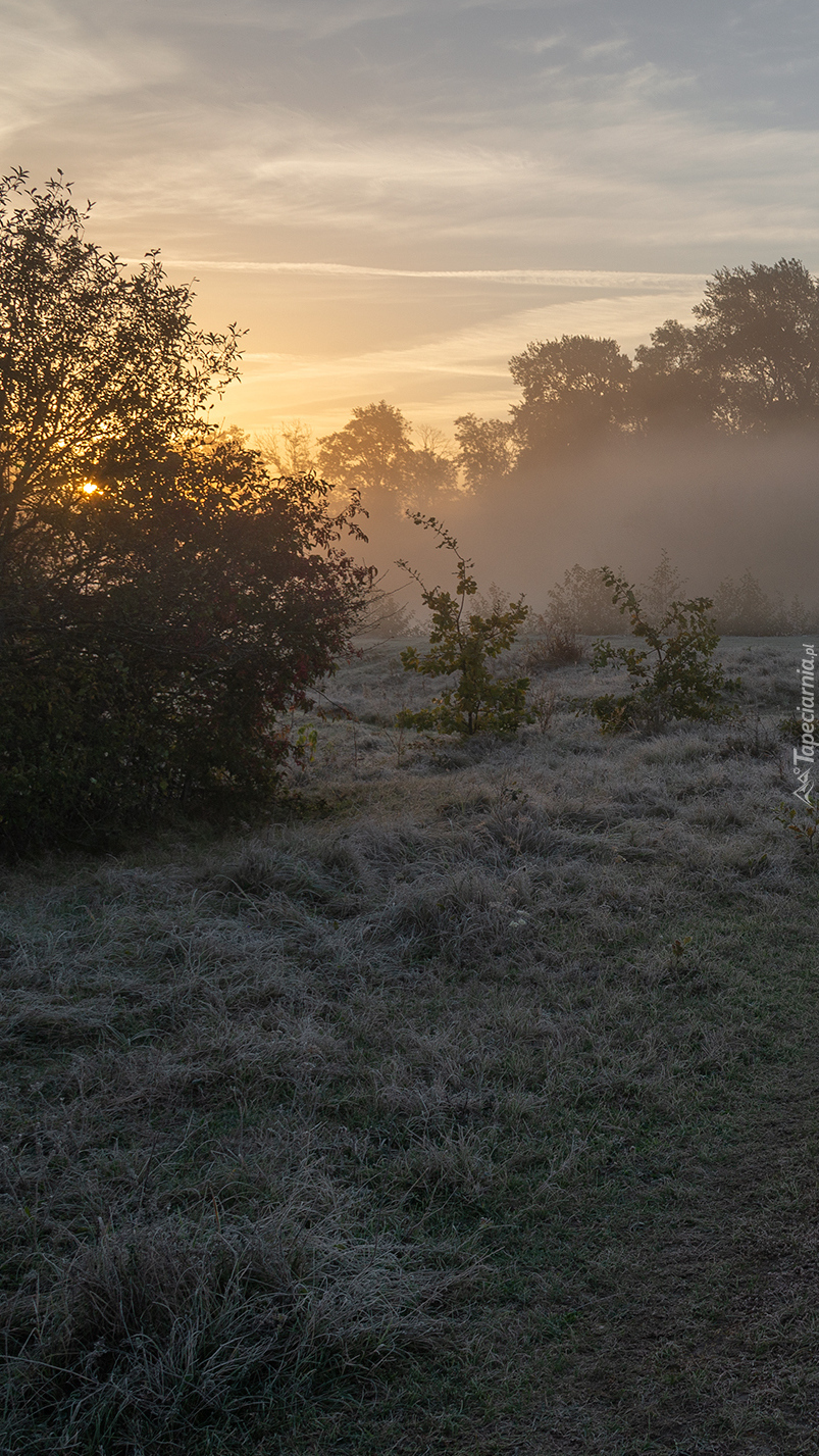 Edytor tapety: Wschód słońca nad oszronioną łąką