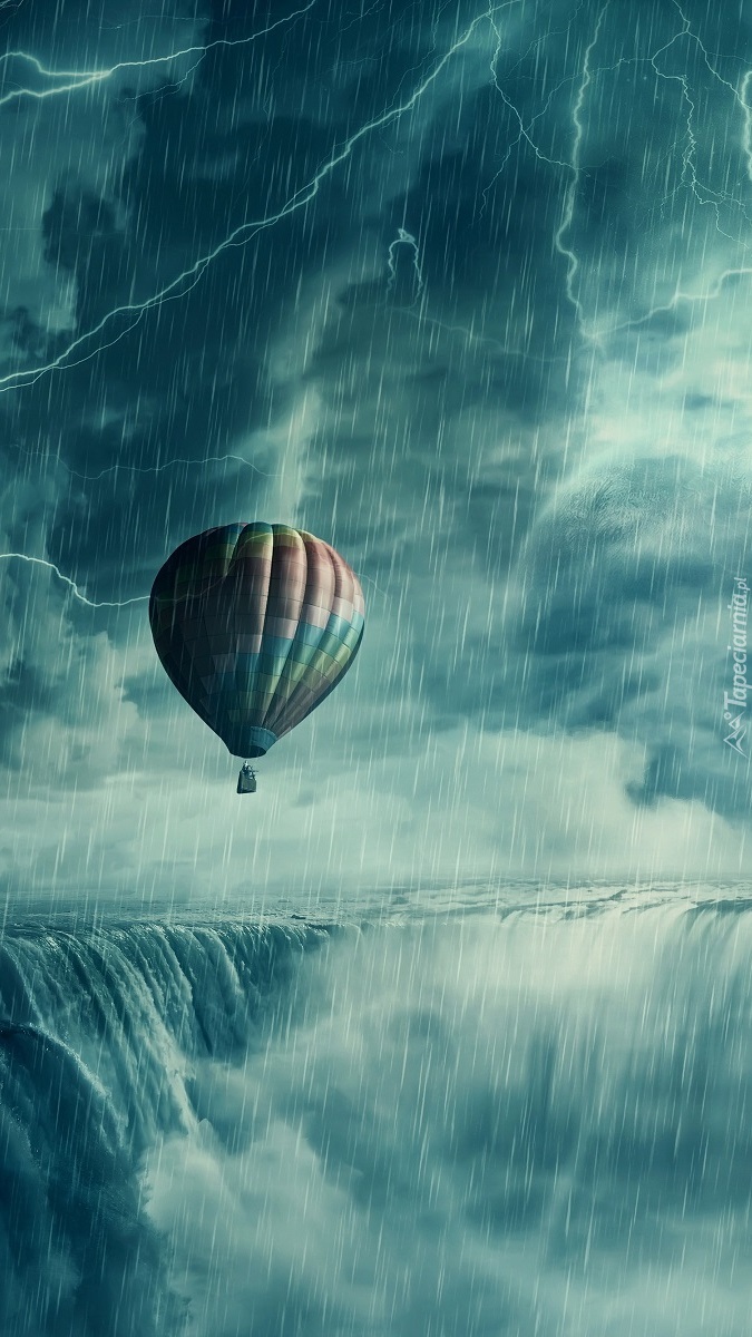 Edytor tapety: Balon podczas burzy nad wodospadem
