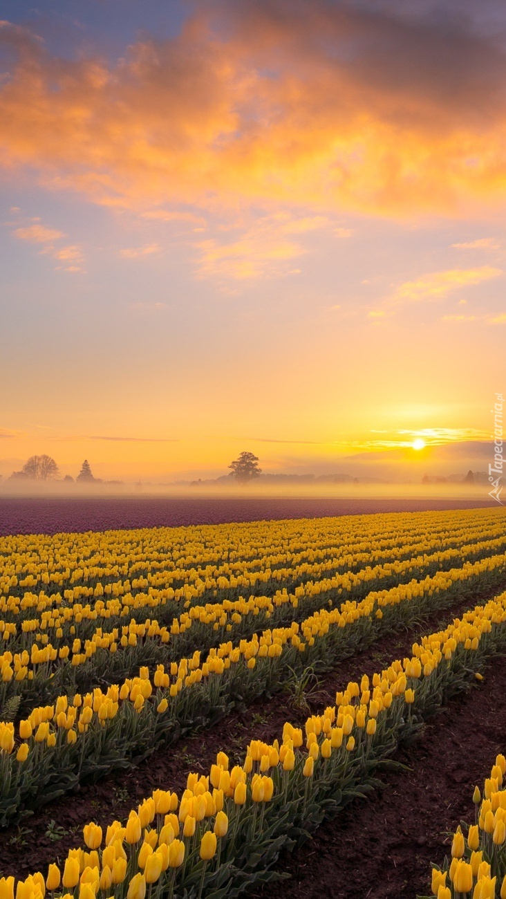 Edytor tapety: Wschód słońca nad plantacją żółtych tulipanów