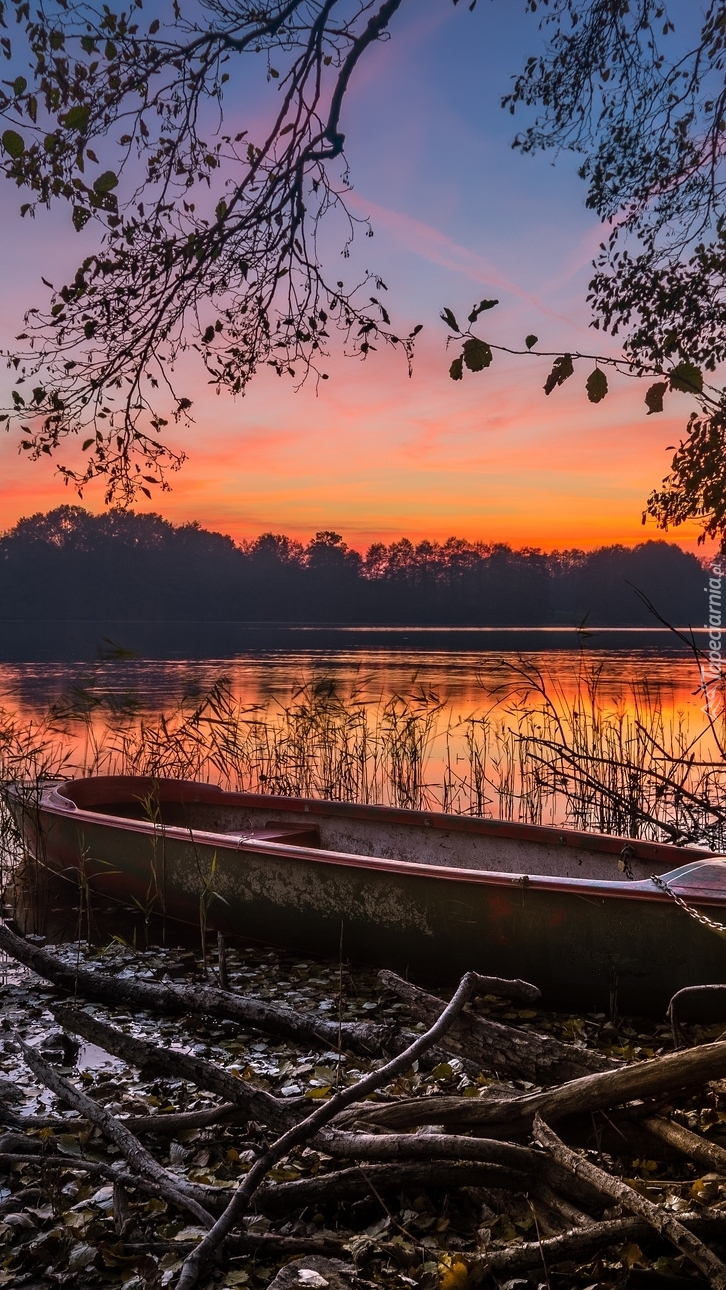 Edytor tapety: Łódka pod drzewem na brzegu jeziora