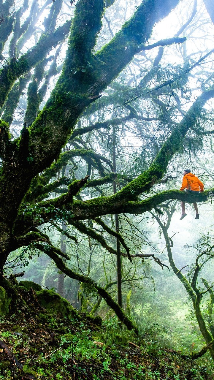 Edytor tapety: Człowiek na gałęzi omszałego drzewa