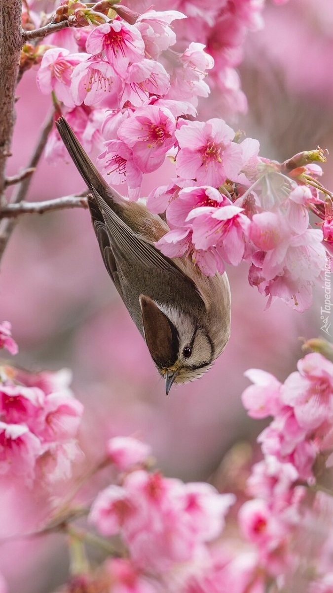 Edytor tapety: Ptak na gałązce z różowymi kwiatami