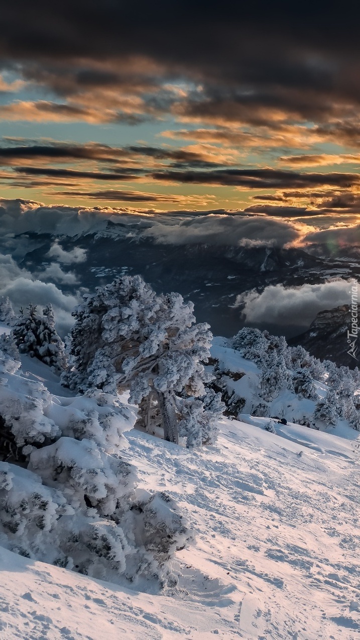 Edytor tapety: Ośnieżone drzewa na stoku
