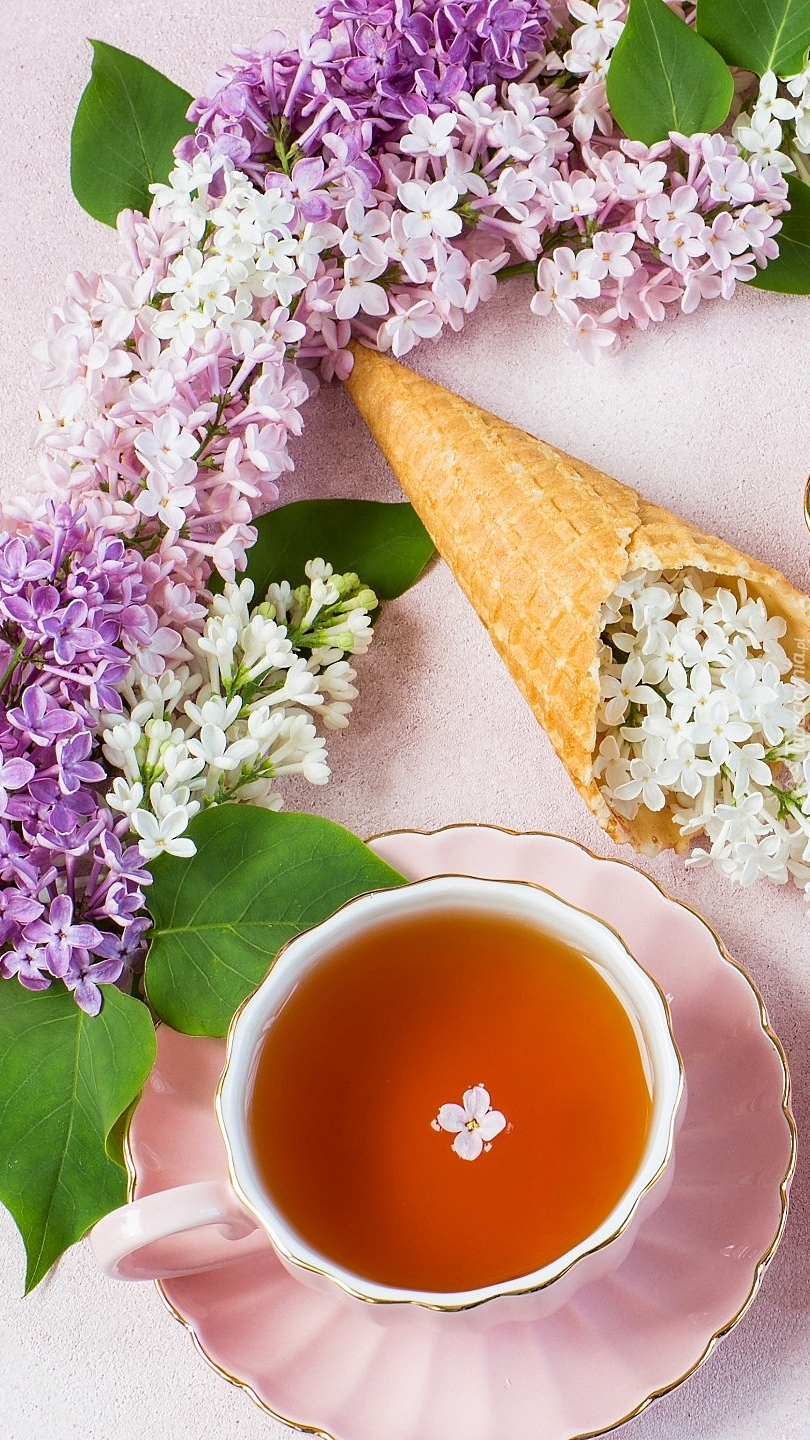 Edytor tapety: Gałązki bzu obok filiżanki z herbatą