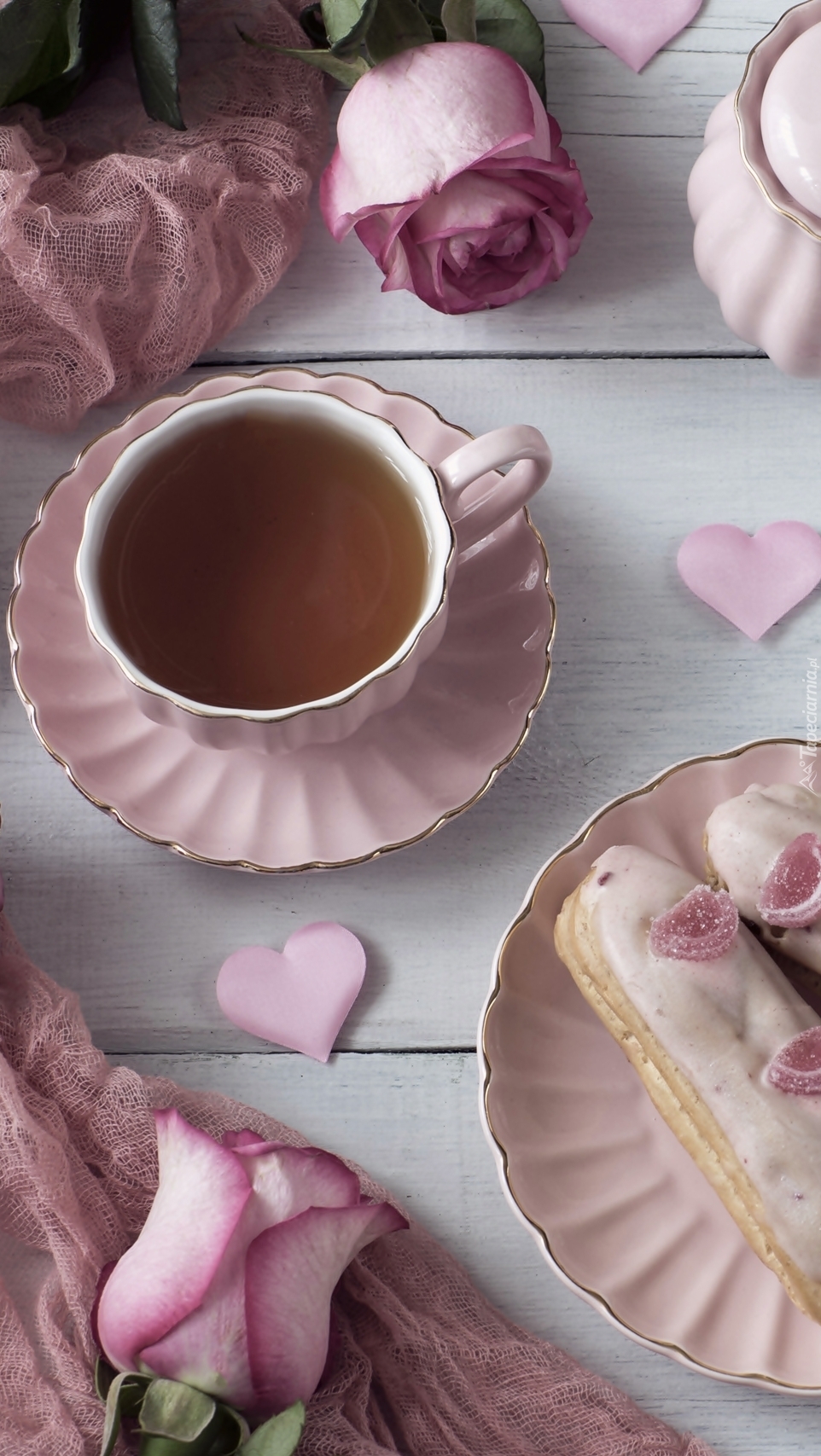 Edytor tapety: Róże przy filiżance herbaty