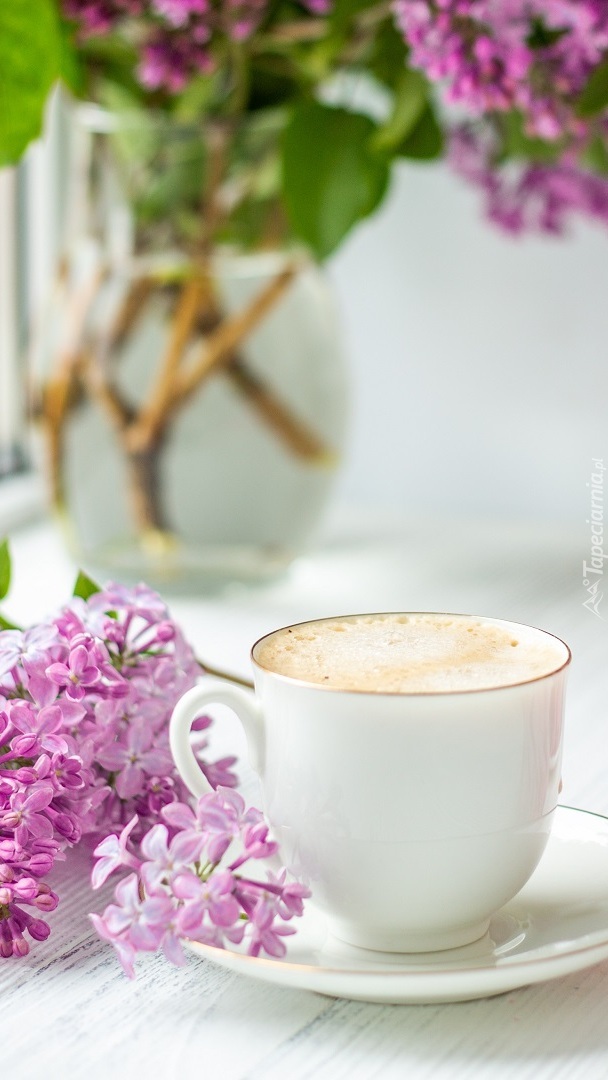 Edytor tapety: Gałązka bzu obok filiżanki z kawą