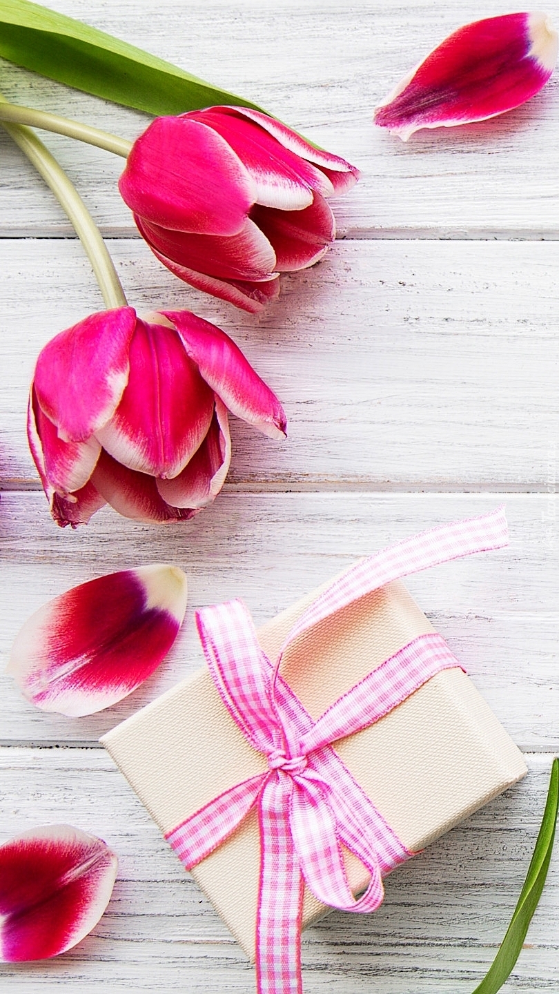 Edytor tapety: Tulipany i jego płatki obok prezentu