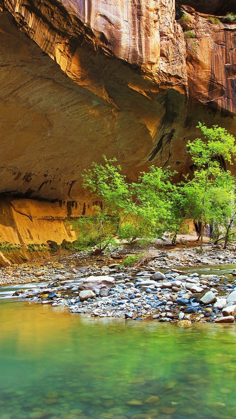 Edytor tapety: Zielone drzewa obok skał nad rzeką
