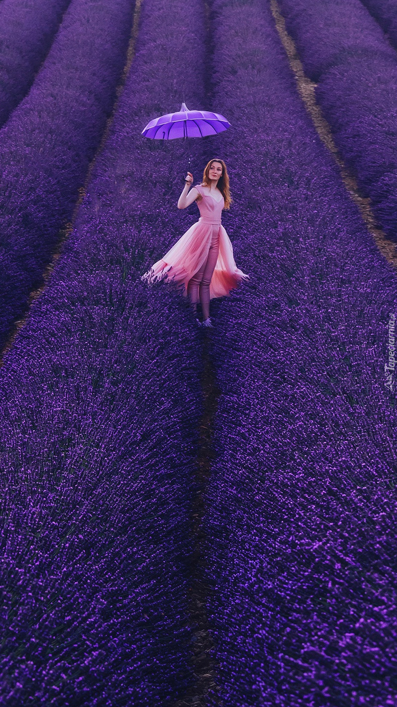 Edytor tapety: Kobieta z parasolką na polu lawendy