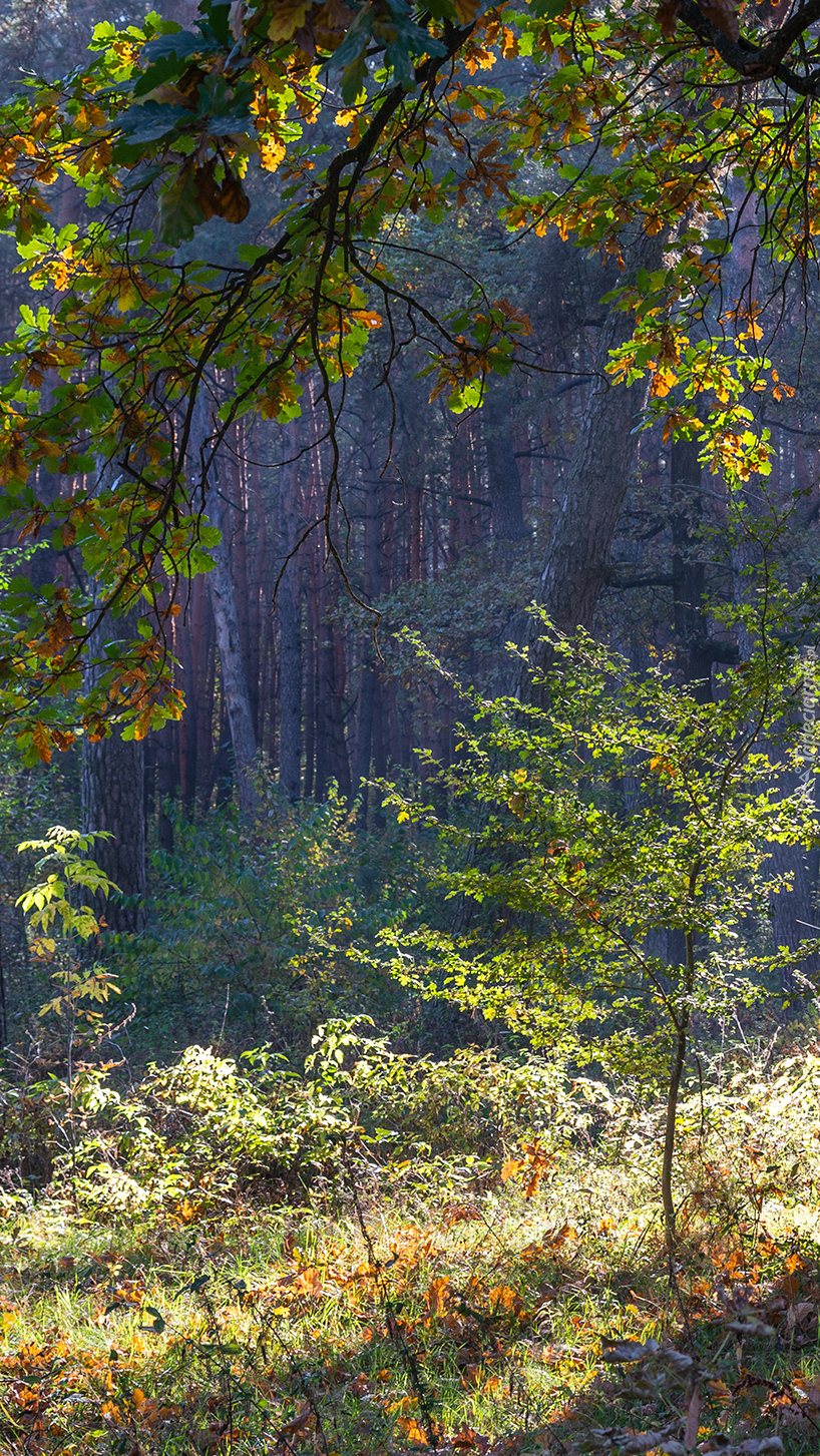 Edytor tapety: Rozświetlone drzewa i krzewy w lesie