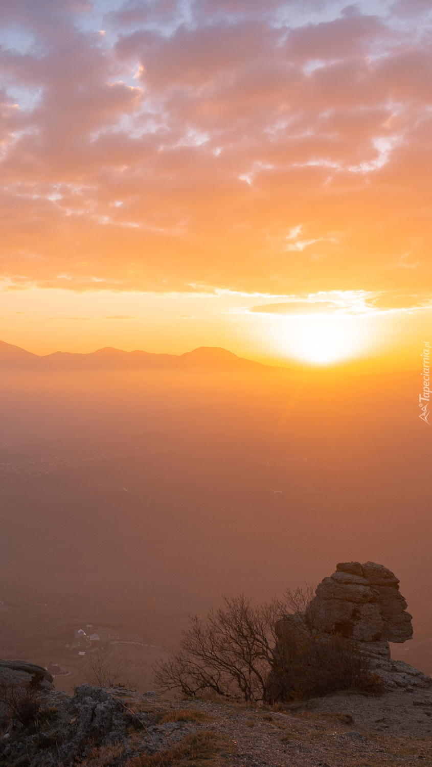 Edytor tapety: Zamglony wschód słońca nad wzgórzami