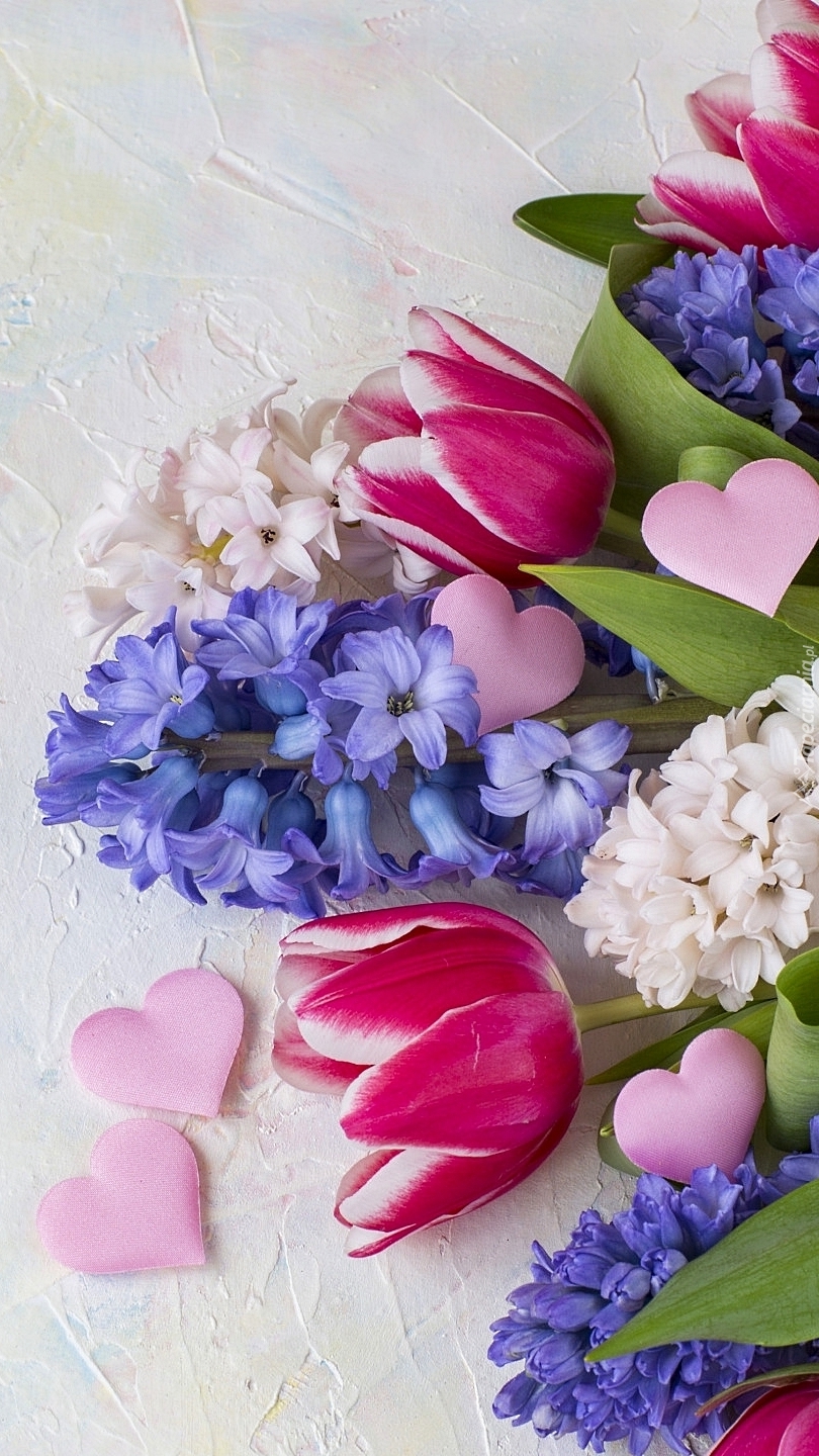 Edytor tapety: Bukiet tulipanów i hiacyntów z serduszkami