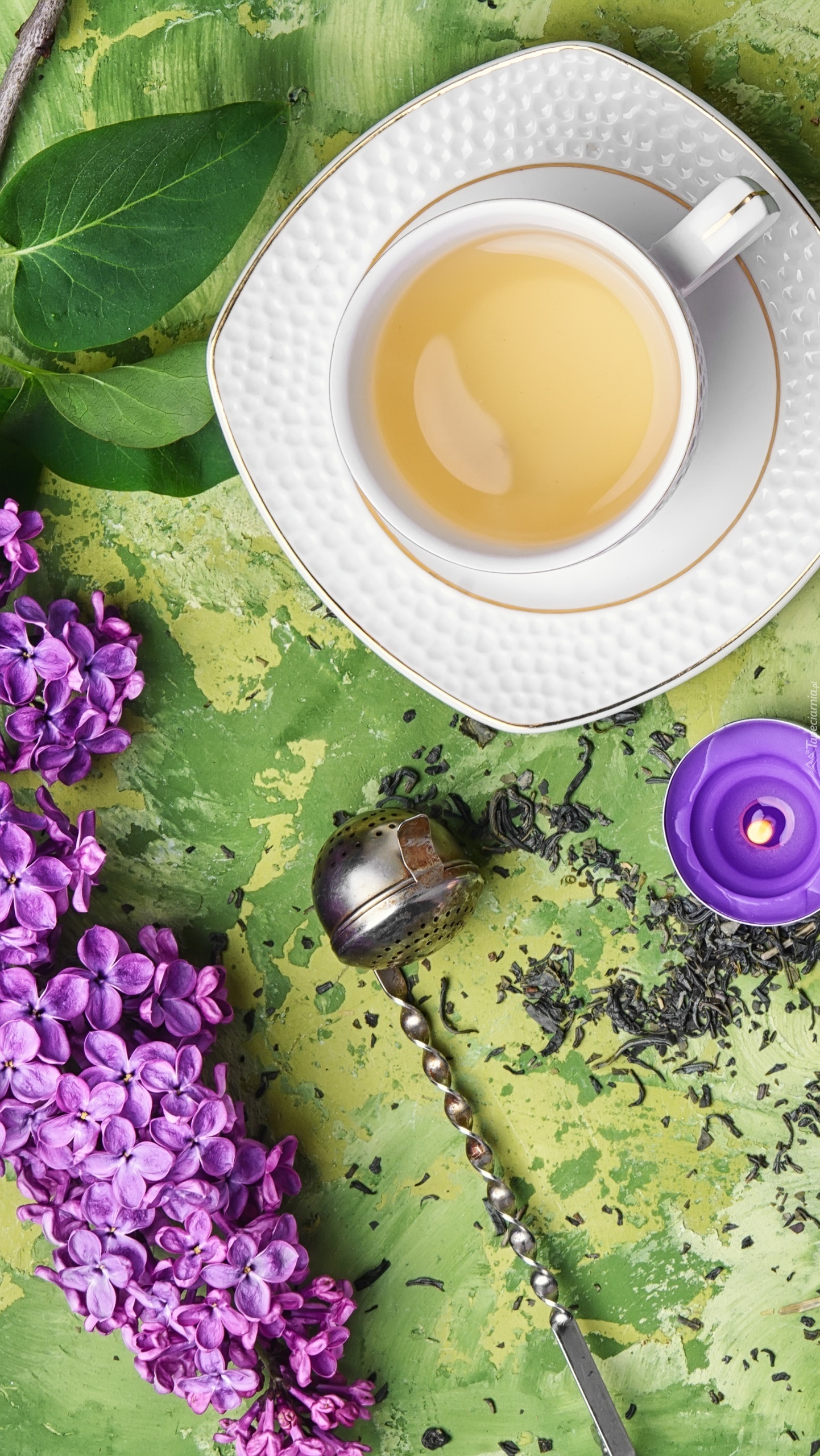 Edytor tapety: Filiżanka z herbatą obok gałązki bzu