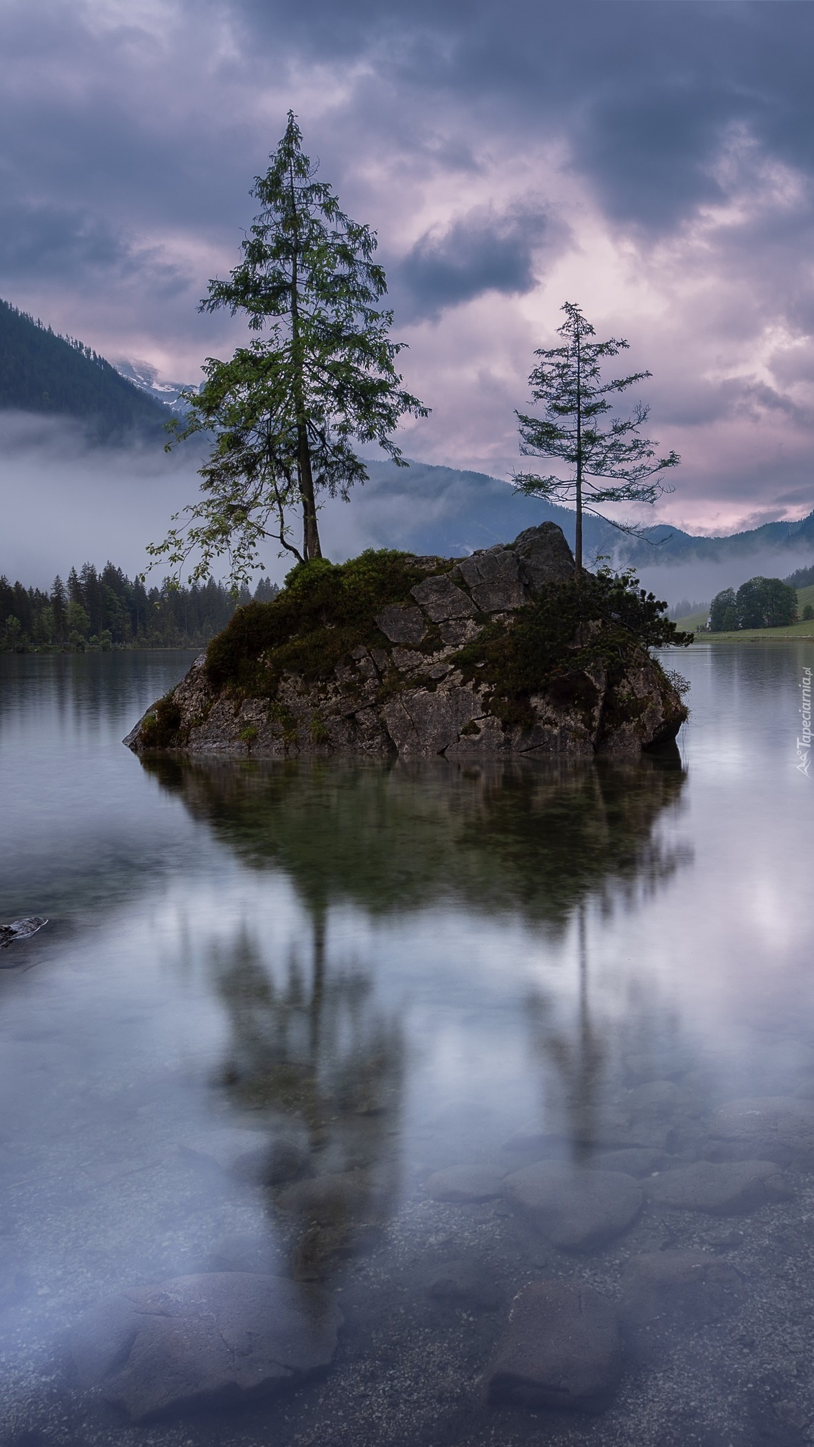 Edytor tapety: Skała z drzewami nad jeziorem Hintersee